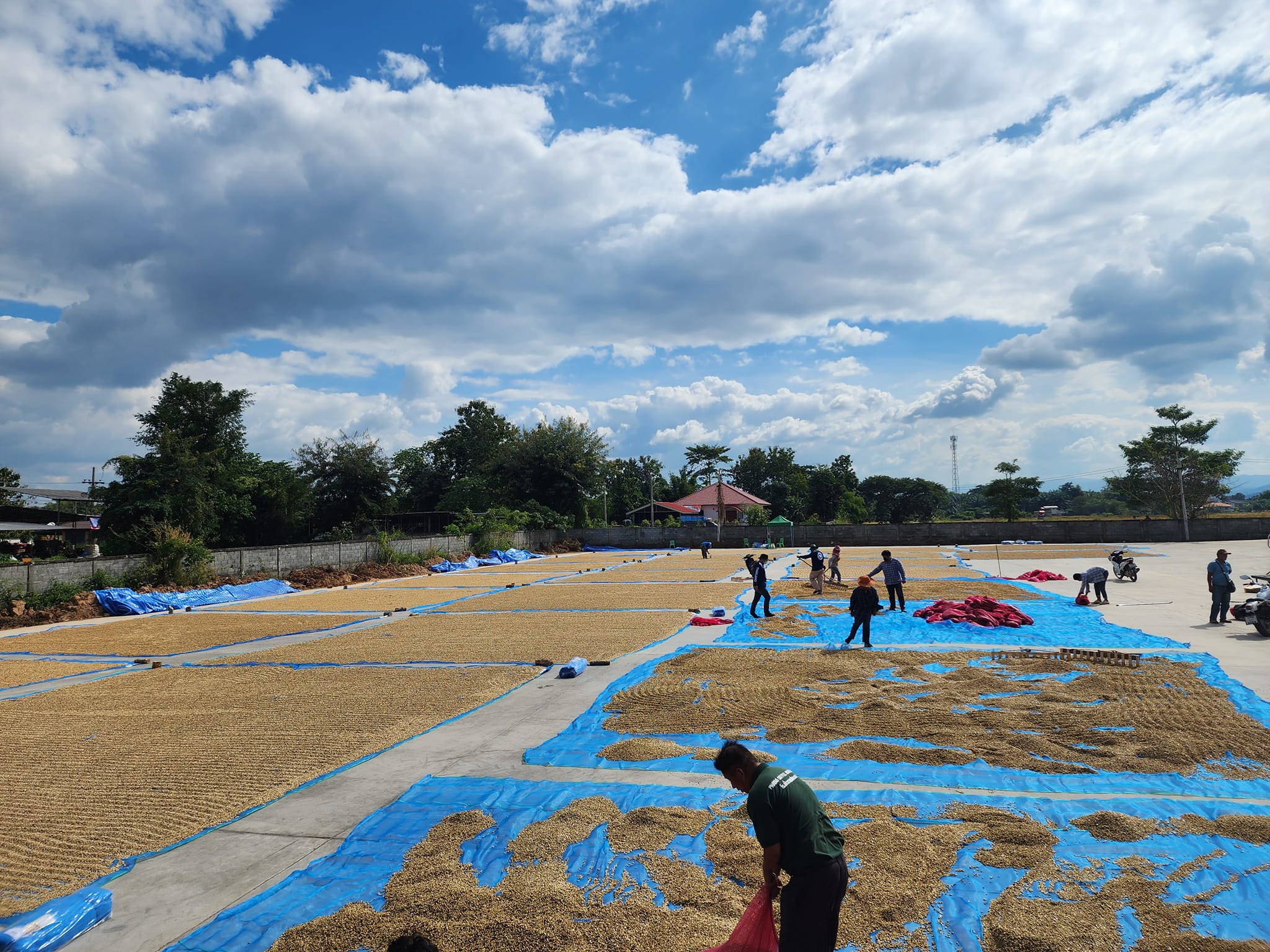ขั้นตอนการตากเป็นอีกหนึ่งขั้นตอนที่มีความสำคัญต่อกลิ่นและรสชาติของกาแฟ ใช้พื้นที่ในการตากค่อนข้างมากเพราะต้องใช้ระยะเวลาตากนาน 7 ถึง 10 วัน โดยวันแรกของ การตากเราจะตากให้บางที่สุด เพื่อให้น้ำที่ติดตรงเมล็ดกาแฟละเหยออกไปให้หมดเพราะถ้าหาก มีน้ำติดค้างอยู่จะมีการหมักเกิดขึ้นอีกครั้งในตอนกลางคืน ทำให้กลิ่นรสของกาแฟเสียไป ตลอดช่วงระยะเวลาที่ตากในตอนเย็นของทุกวันเราต้องเก็บเมล็ดกาแฟกองไว้เพื่อตรวจวัดความชื้น แล้วคลุมด้วยผ้าพลาสติกเพื่อป้องกันความชื้นจากน้ำค้างเพราะเป็นช่วงฤดูหนาว และจะทำการตาก เมล็ดกาแฟใหม่ในตอนเช้าเพื่อให้ได้เมล็ดกาแฟที่มีคุณภาพ เมื่อตากเมล็ดกาแฟกะลาจนได้ความชื้น ที่ต้องการแล้ว เราจะทำการเก็บบรรจุกระสอบเพื่อเข้าสู่กระบวนการบ่มเมล็ดกาแฟต่อไป